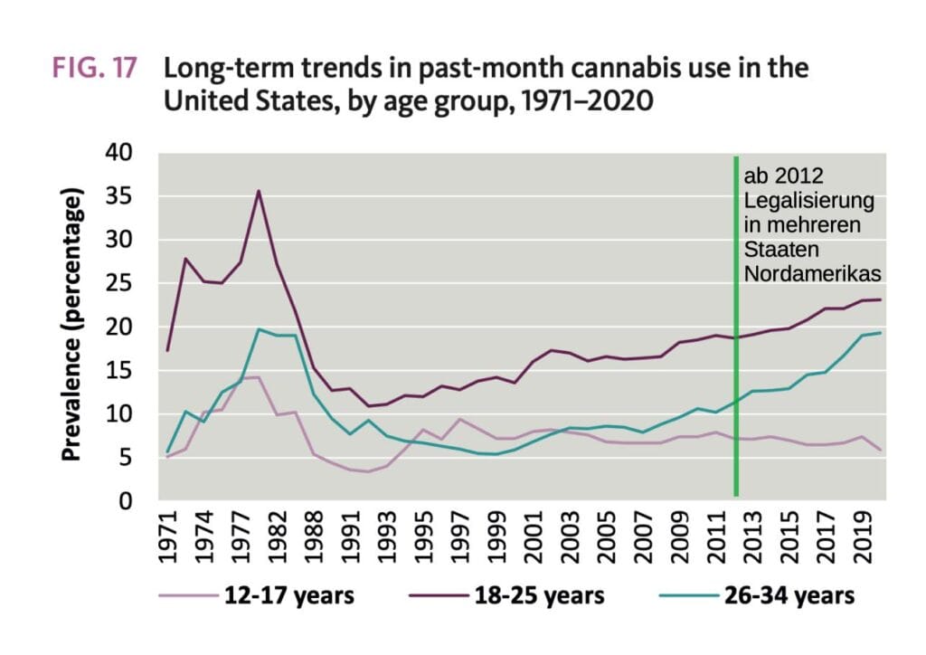 Korrekt ist, dass der Cannabis-Konsum schon seit den 1990ern zunimmt – und zwar in vielen Ländern. Auf der Abbildung ist das für die USA zu sehen und habe ich den Zeitpunkt der in immer mehr US-Bundesstaaten einsetzenden Legalisierung eingezeichnet. Die politischen Maßnahmen laufen also dem Verhalten der Bürgerinnen und Bürger hinterher, nicht andersherum.